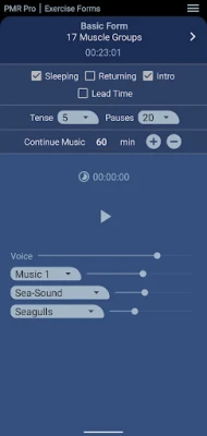 For all exercises, you can select among 5 relaxation music tracks and 22 nature sounds. The volume can be adjusted individually. If desired, the music & sounds can also be used without voice to relax or fall asleep.